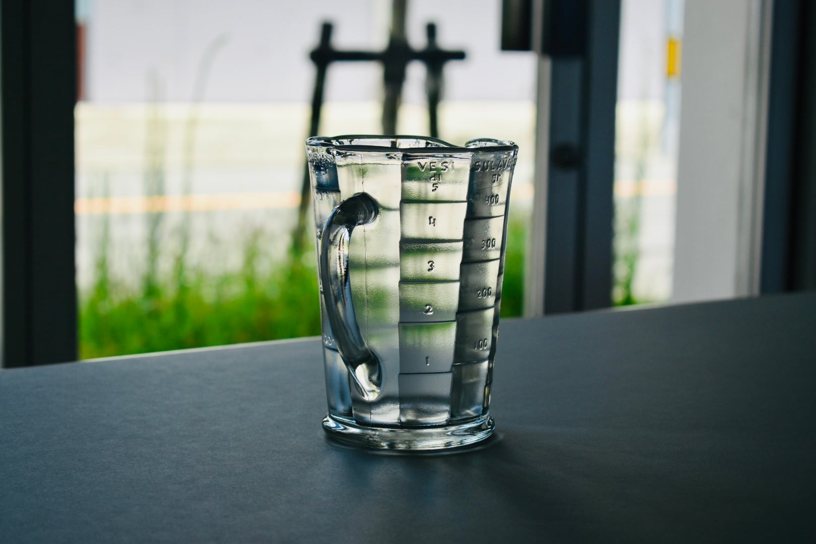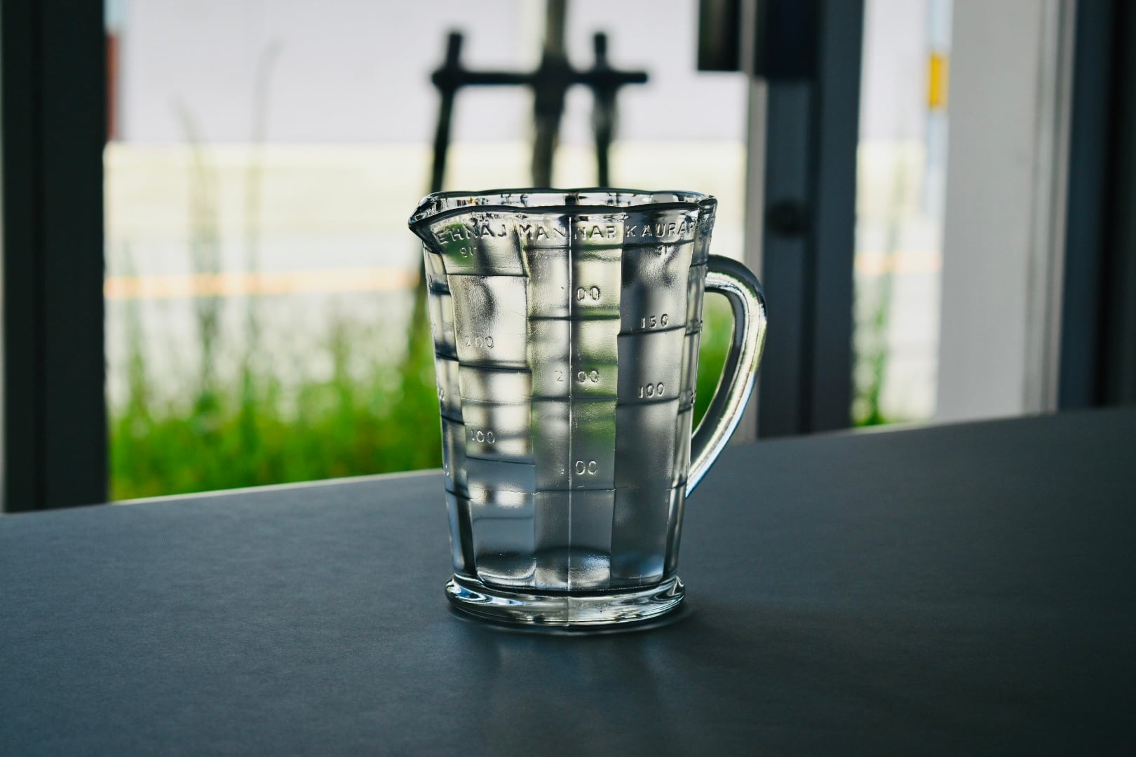 1950-60年代に生産されたプロダクト。vesi(水)、sokeri(砂糖)、siirappi(シロップ)などの文字が表記されており、素材ごとに分量を測ることができる。取手や注ぎ口の形状は、Bolgeblickシリーズのピッチャーにも通じるものがある。