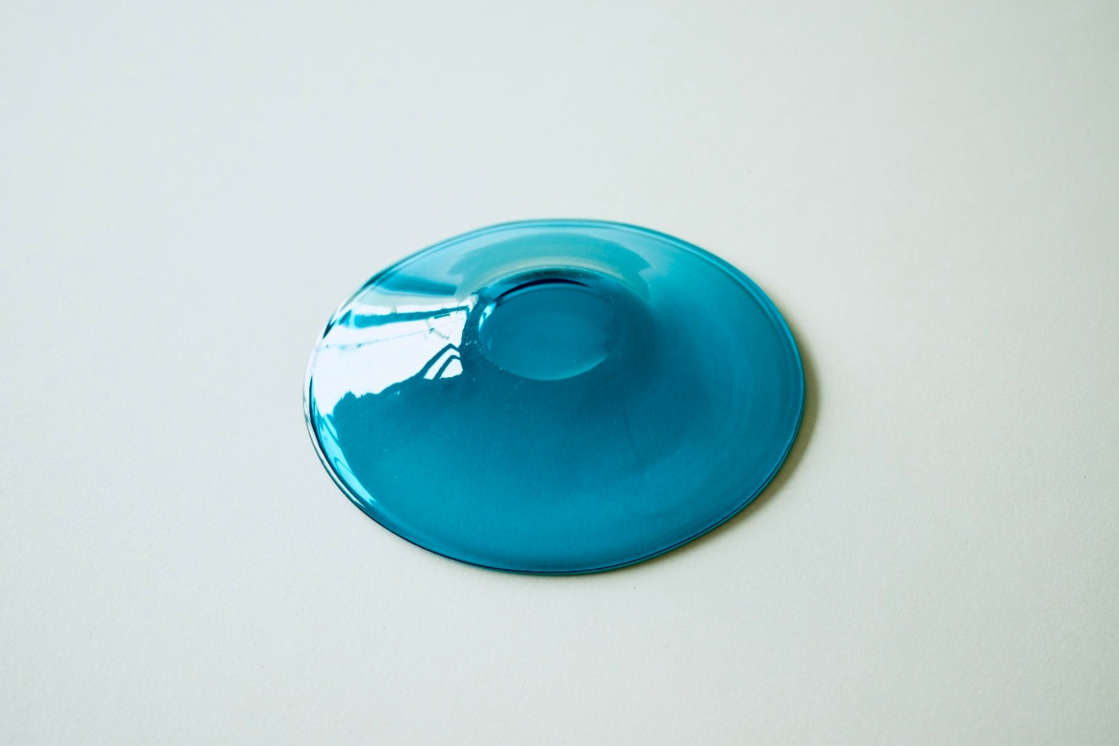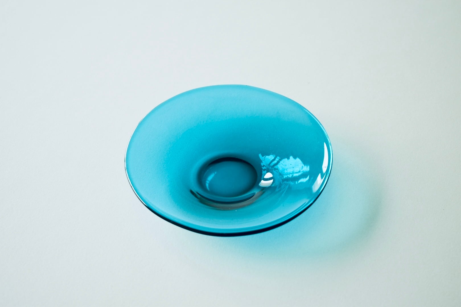 1950年にデザインされたガラスプレート。宙吹きにより制作されており、柔らかさや温かみが感じられる。また、僅かに設けられた高台からは、軽やかな印象も受ける。